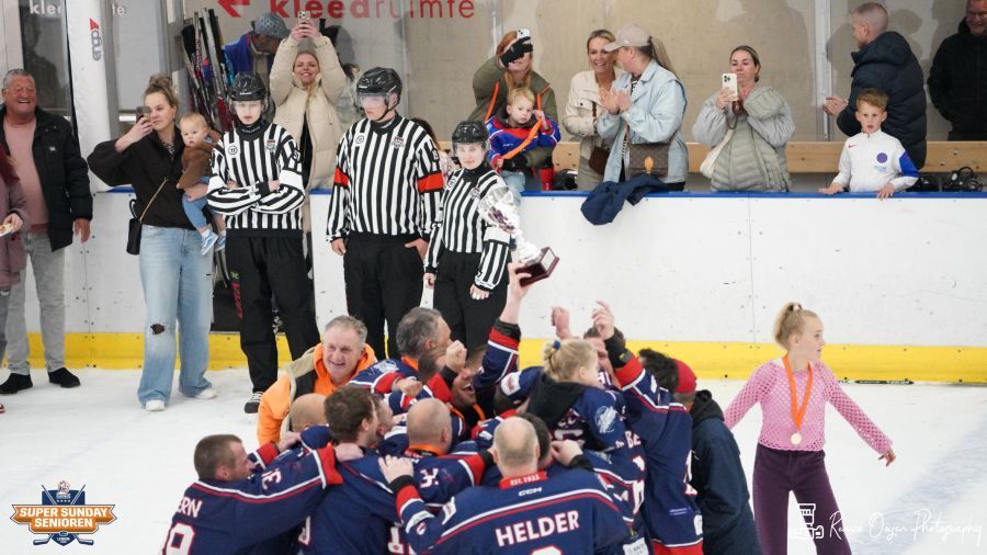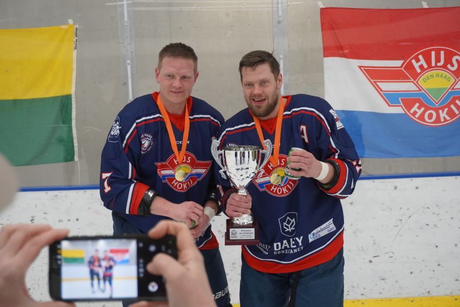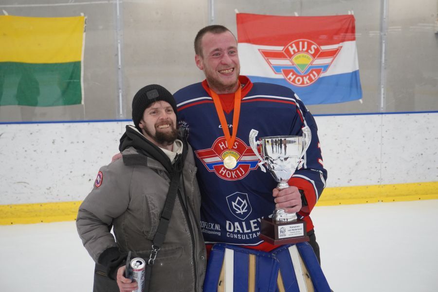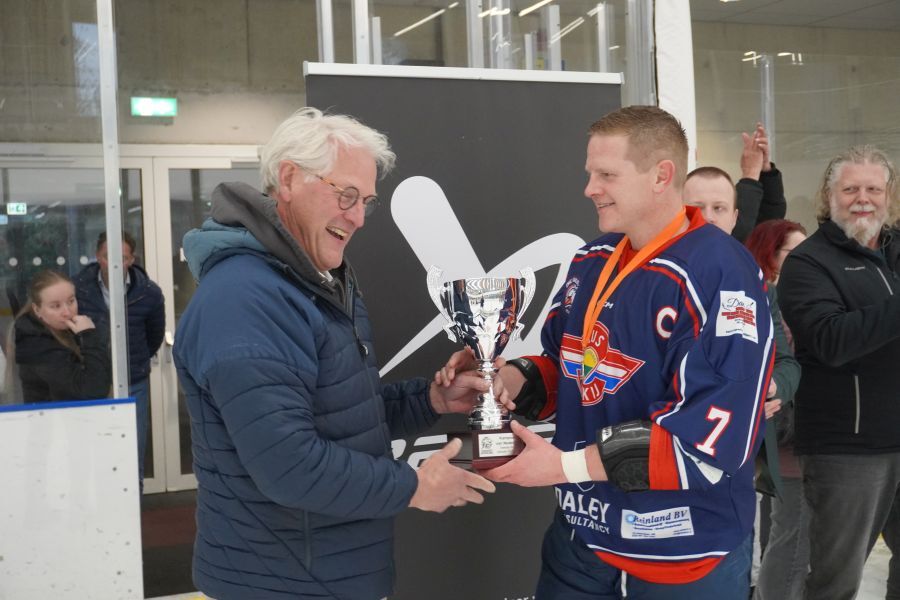 Aaanvoerder Alan van Bentem van HIJS HOKIJ Den Haag 2 krijgt de landskampioenbeker Tweede Divisie 2025-2026 uitgereikt door Theo van Gerwen (Directeur IJshockey Nederland) — © IJshockey Nederland - Hans Eeuwes