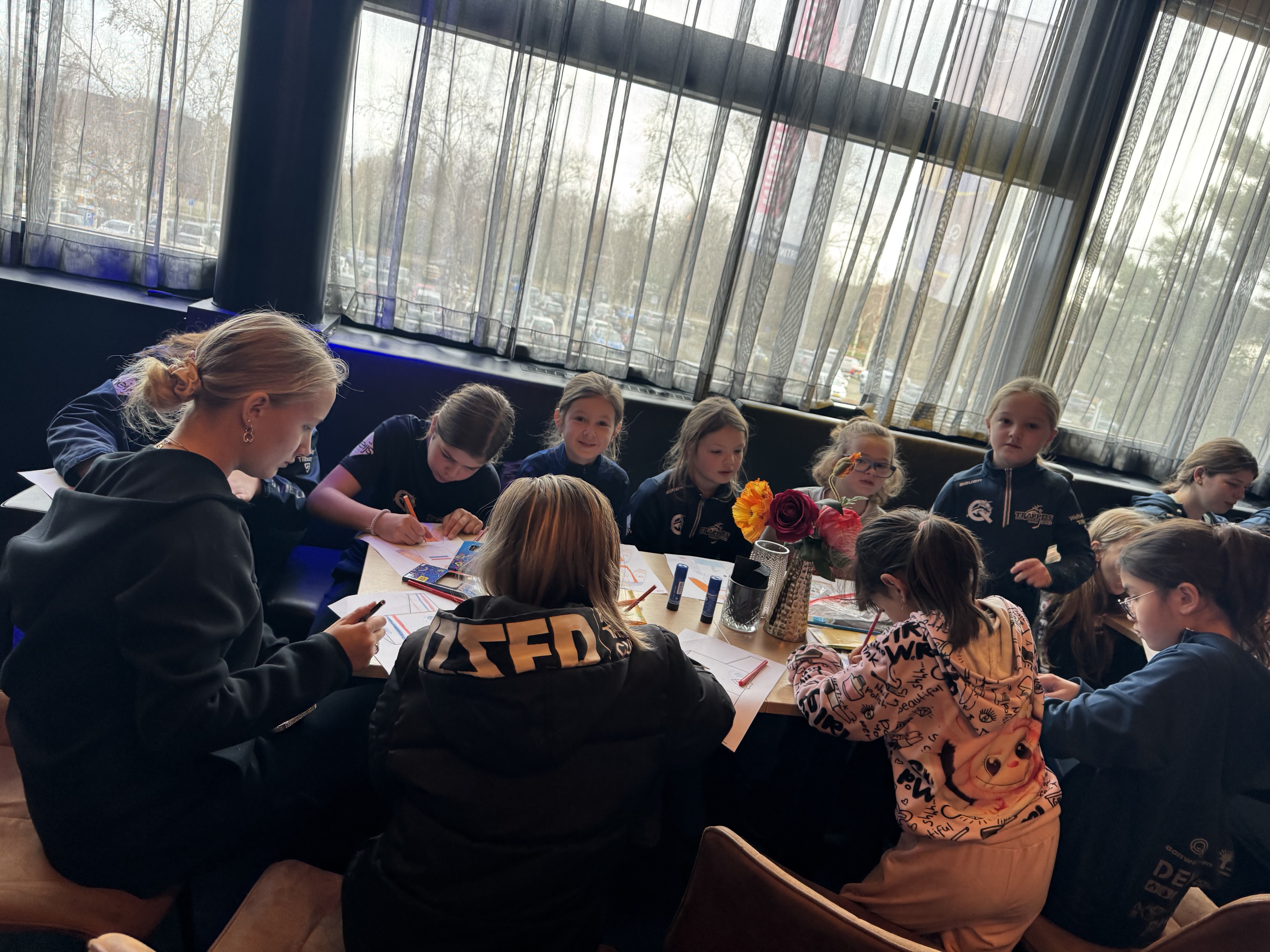 Groep 2 maakte zich klaar voor hun ijstraining die in station training werd georganiseerd. Deze opzet bood de deelnemers de kans om intensief te werken aan verschillende technieken. Ondertussen had groep 1 de mogelijkheid om even bij te komen van hun eerdere activiteiten. Ze namen deel aan het ontwerpen van een Nederlands teamshirt, waarbij de creativiteit hoogtij vierde. Het was geweldig om te zien dat speelsters van de U18-selectie zich bij de allerkleinste voegden. Ze hielpen met het ontwerpen en beantwoordden vragen, wat de jongere meisjes enorm waardeerden. Deze interactie zorgde voor een gevoel van saamhorigheid en hielp de jongere deelnemers om zich onderdeel van een groter geheel te voelen. De aanwezigheid van de oudere speelsters was niet alleen inspirerend, maar ook ontzettend motiverend voor de jonge talenten.