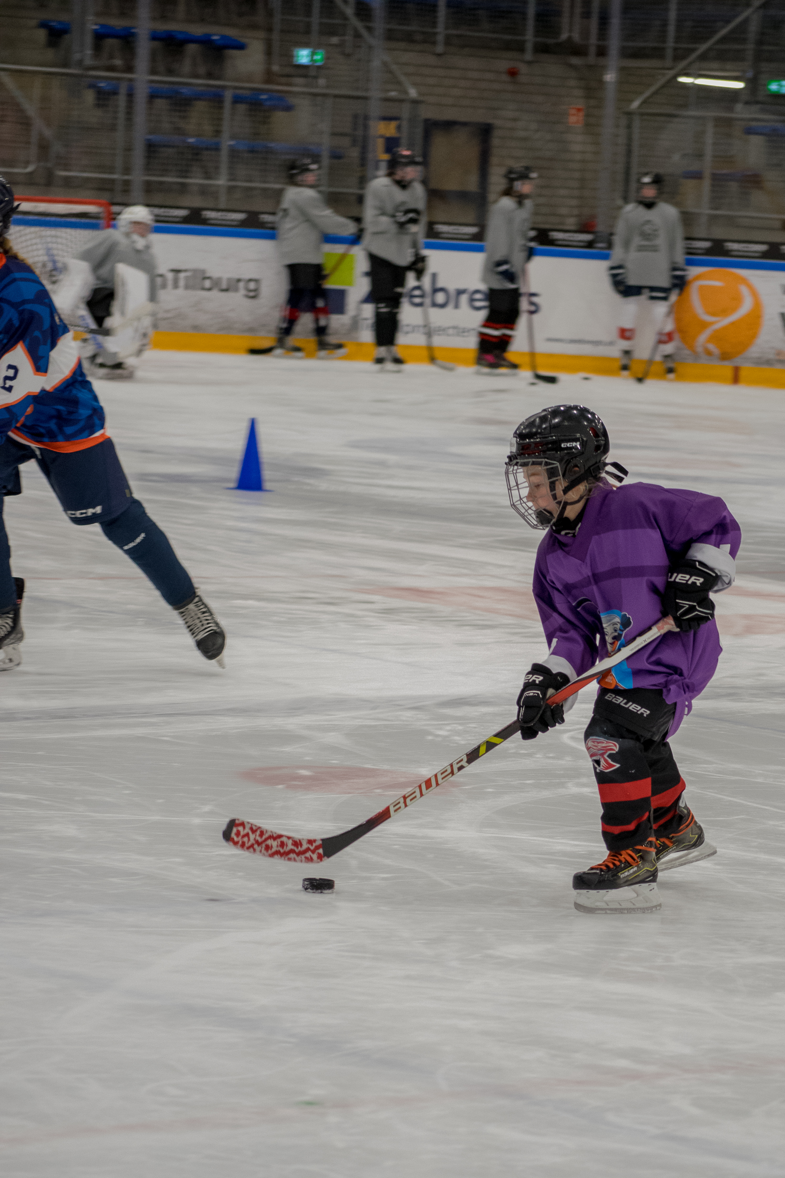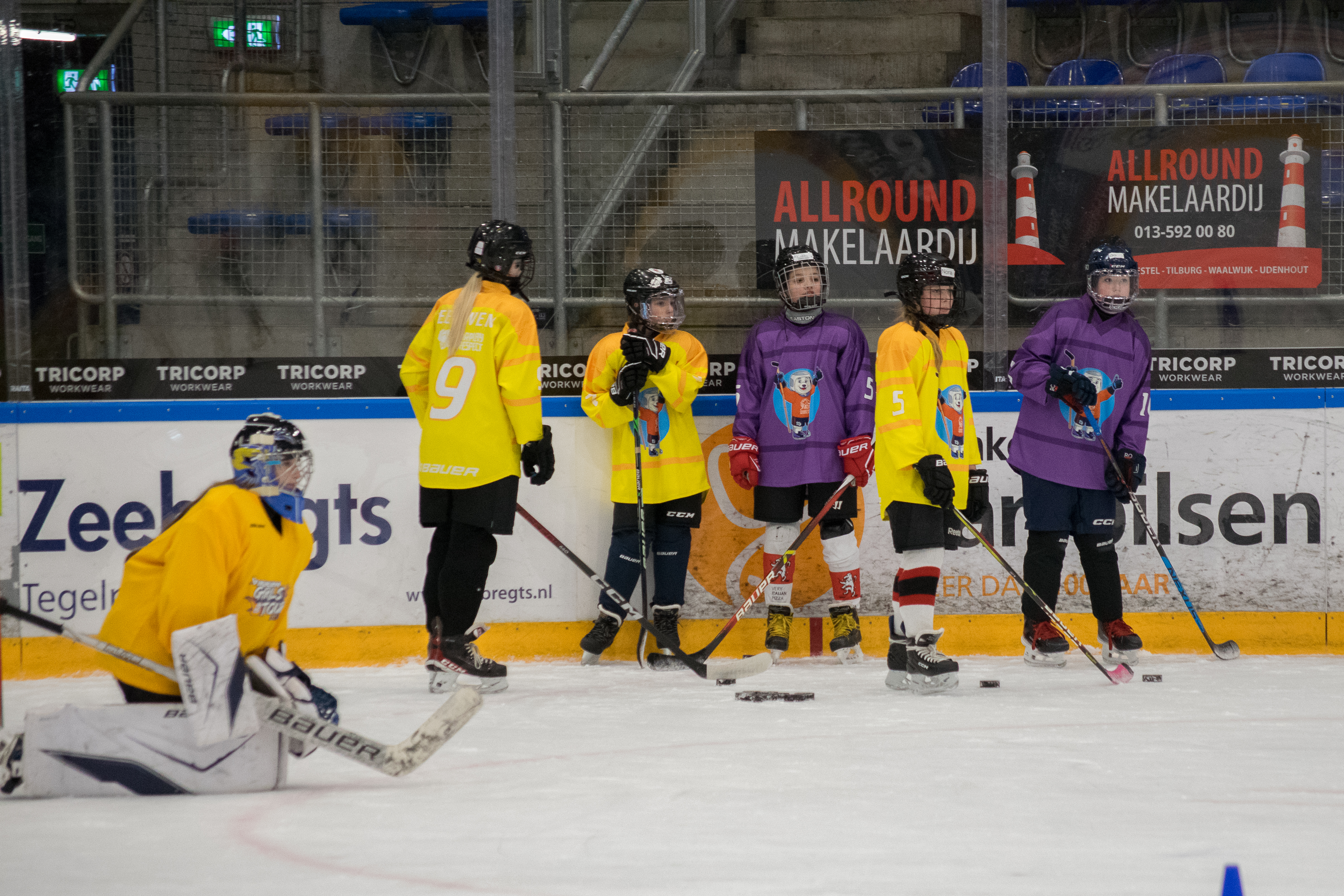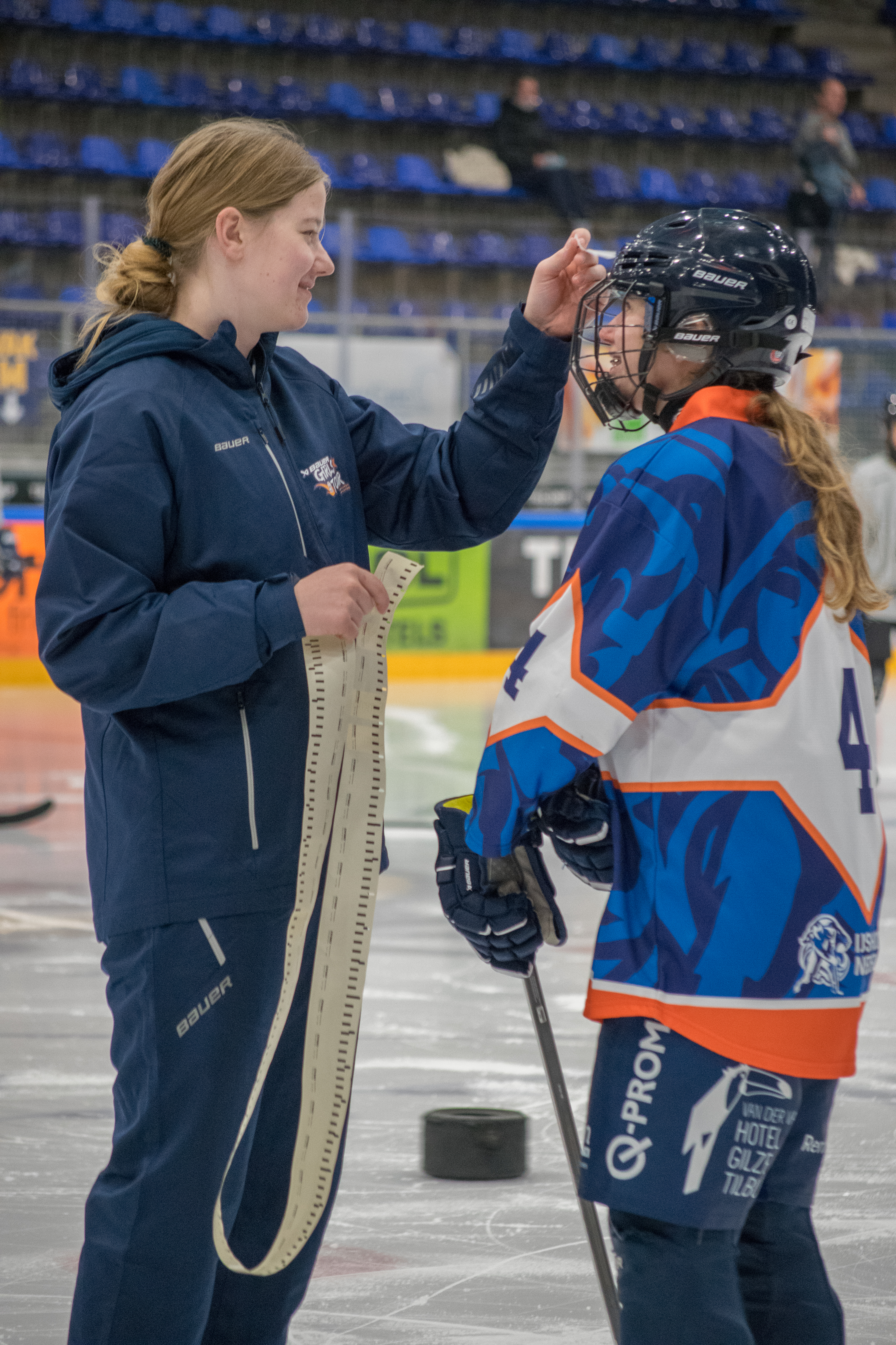 De Nationale Bauer Girls Dag was een groot succes, met 95 enthousiaste deelnemers. Al bij het aanmelden hing er een gezellige sfeer, mede dankzij de ouders die zich als vrijwilliger hadden aangemeld en fantastisch hebben geholpen de gehele dag. We hadden de deelnemers in 2 groepen verdeeld en na het trainings en off-ice programma werden ze verdeeld over 8 teams. Groep 1 begon de dag met off-ice activiteiten. Deze sessies waren gericht op spelvorm spellen, er werd veel gelachen en de meiden werkten hard samen. Groep 2 kreeg de opdracht om een Nederlands team shirt te ontwerpen. De creativiteit van de deelnemers kwam duidelijk naar voren in de prachtige ontwerpen die werden gepresenteerd. Het was inspirerend om te zien hoe elk ontwerp uniek was maar ook wat ze belangrijk vinden wat er op een shirt moet komen.